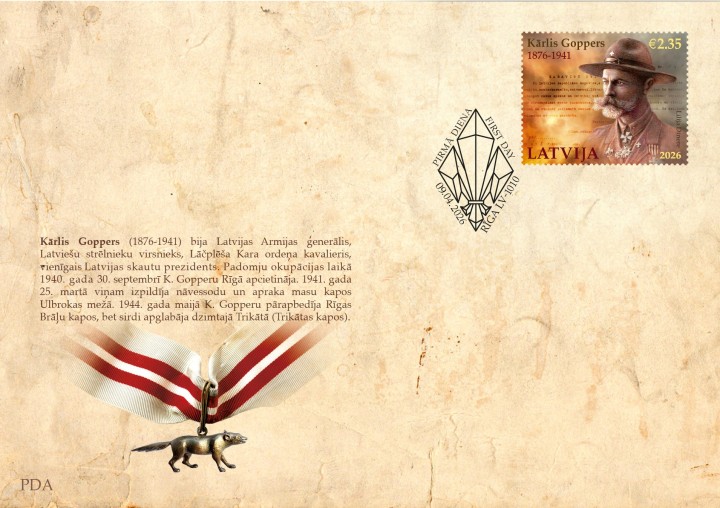 In 2026, the 150th anniversary of Kārlis Goppers’ birth will be marked, and Latvijas Pasts commemorates the General of the Latvian Armed Forces by issuing a postage stamp, “Kārlis Goppers 150”, with a face value of €2.35. The stamp will be issued in a print run of 10,000 copies, while the specially designed envelope will be limited to 500 copies. The philatelic issues were designed by renowned artist Lilija Dinere.